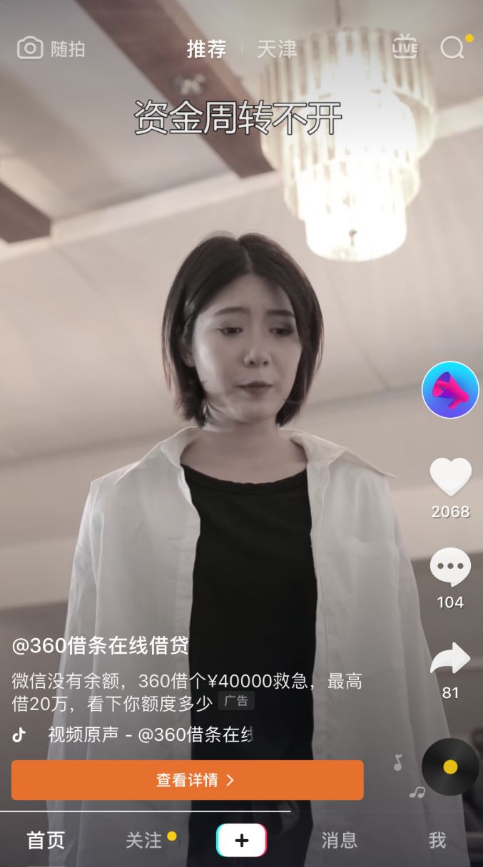 今年开始,抖音似乎开始加快了变现步伐,金融客户的数量有迅速增加的趋势。“基本上市面上叫得上名字的贷款平台,都能在抖音广告上看到了。”抖音内部一位销售这样说到。