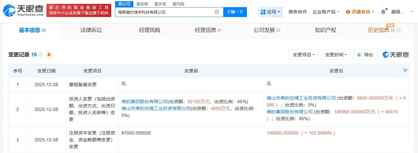 天眼查App显示,近日,海南美的楼宇科技有限公司发生工商变更,注册资本由9.7亿人民币增至19.68亿人民币,增幅约103%。