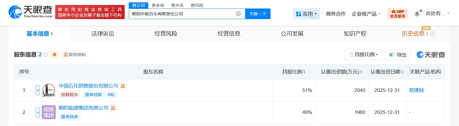 天眼查工商信息显示,近日,朝阳中能石化有限责任公司成立,法定代表人为李相伯,注册资本4000万人民币,经营范围含石油制品销售、服装服饰零售、日用品销售、五金产品零售、电子产品销售、润滑油销售、照相机及器材销售、汽车销售、汽车零配件零售、新能源汽车换电设施销售、新能源汽车整车销售等。股东信息显示,该公司由中国石化销售股份有限公司、朝阳能源集团有限公司分别持股51%、49%。