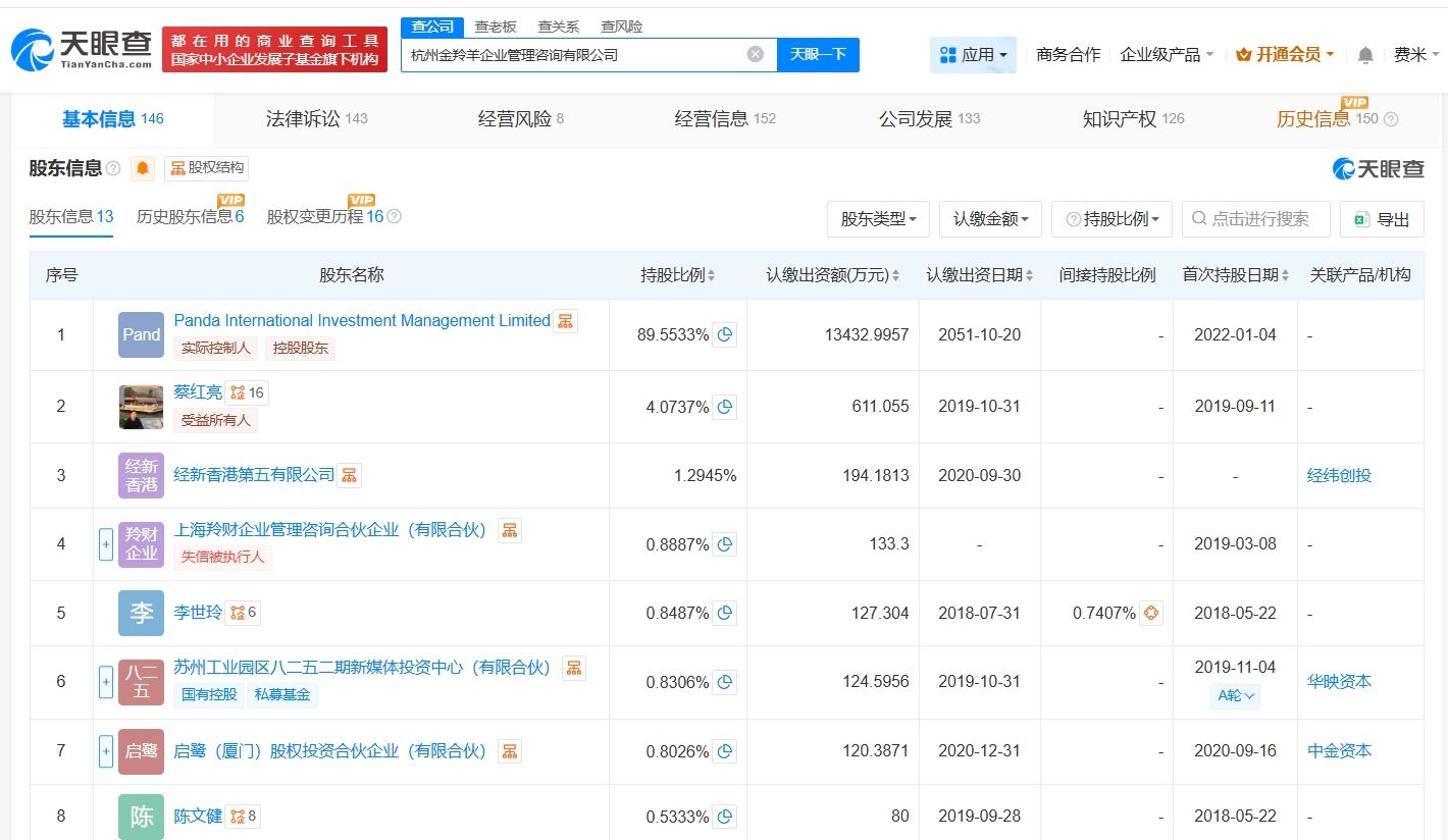 该公司成立于2018年5月,法定代表人、董事长、总经理为蔡红亮,注册资本1.5亿人民币,由Panda International Investment Management Limited、蔡红亮、经新香港第五有限公司等共同持股。