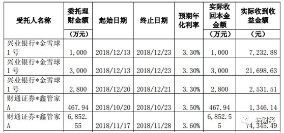 2018年第四季度购买理财产品的汇总说明显示,公司总委托理财金额9亿,收回本金5亿,还有4亿在投中。而投资产品中,受托人为被公司屡屡抛售的财通证券占了一大部分,并且相同类型的产品财通证券给出的预期收益率都要高一些。
