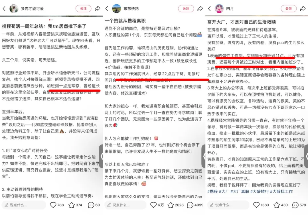 去小红书上翻一翻,更是触目惊心——一堆携程离职员工实名吐槽,加班到10点是常态。随便放几张截图,你们自己品。