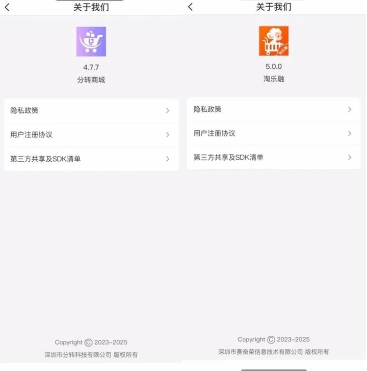 但淘乐融的注册协议显示,该平台的运营主体为深圳市赛奋荣信息技术有限公司(本文称“赛奋荣信息”)。而此前分转商城的运营主体为深圳市分转科技有限公司(本文称“分转科技”)。