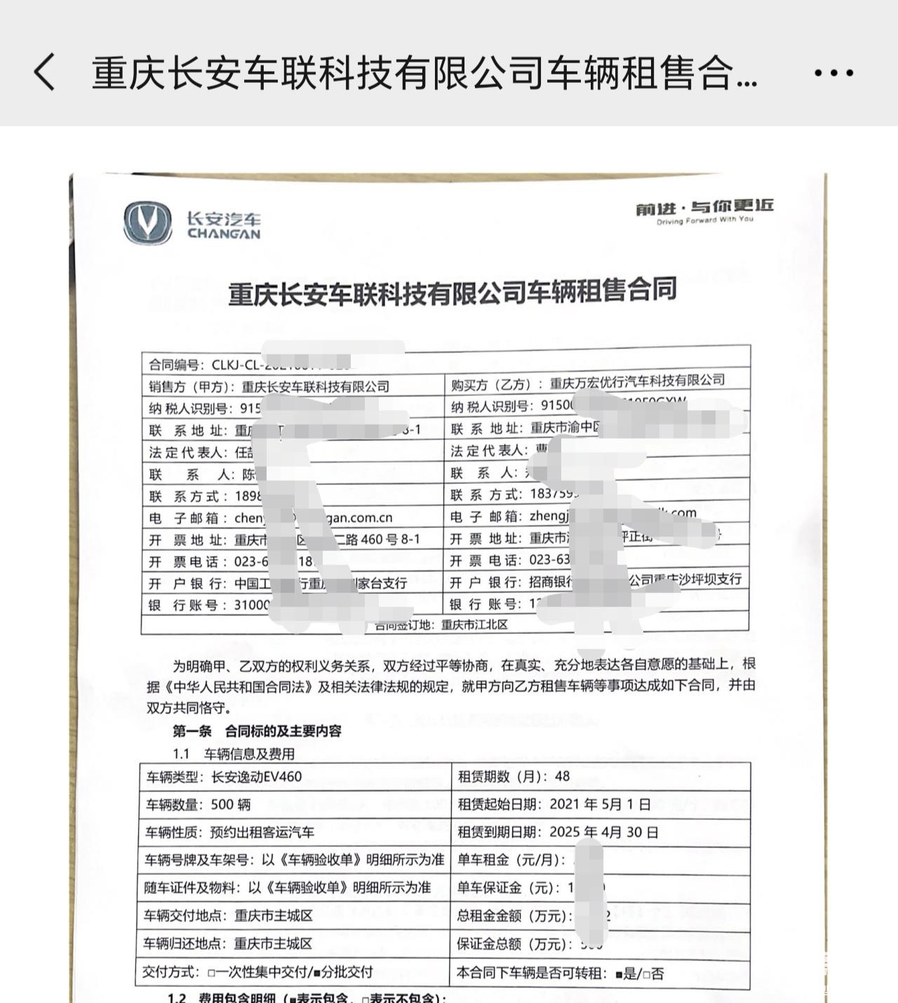 鲁先生介绍,2021年,重庆长安车联科技有限公司(长安汽车全资子公司)将500台“长安逸动EV460”车辆租售给重庆万宏优行汽车科技有限公司(以下简称万宏公司)。2023年,万宏公司将其中400台出售给微笑出行。