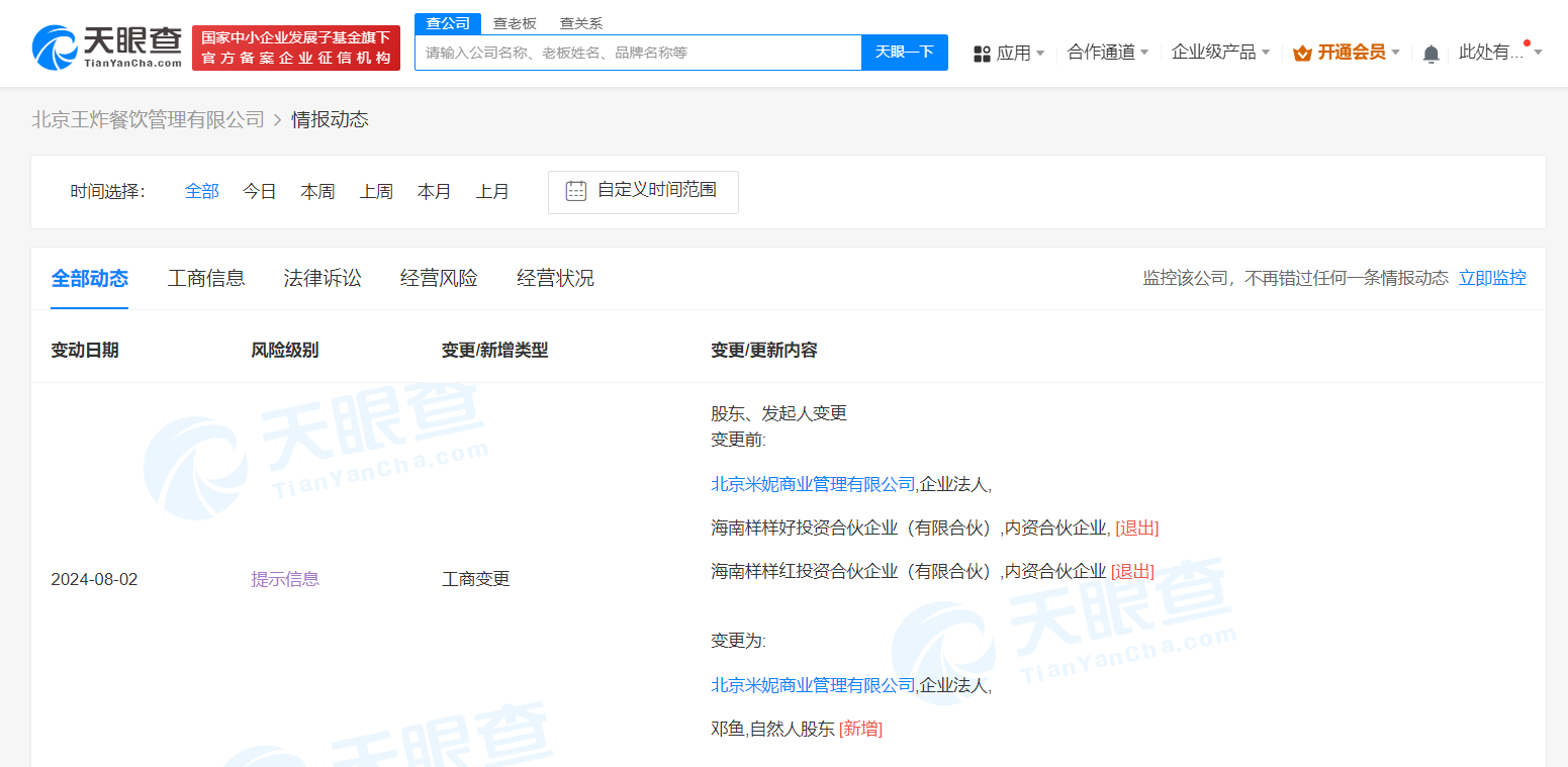 天眼查App显示,近日,北京王炸餐饮管理有限公司发生工商变更,王迪(王鹤棣经纪人)实控的海南样样好投资合伙企业(有限合伙)、海南样样红投资合伙企业(有限合伙)退出股东行列,新增邓鱼为股东,同时,公司部分主要人员发生变更。