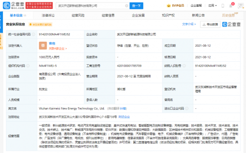 【TechWeb】企查查APP显示,近日,武汉开迈斯新能源科技有限公司成立,法定代表人为曹嘉,注册资本为1000万元人民币,公司经营范围含新兴能源技术研发;电动汽车充电基础设施运营;集中式快速充电站;智能输配电及控制设备销售;数据处理和存储支持服务;大数据服务;区块链技术相关软件和服等。