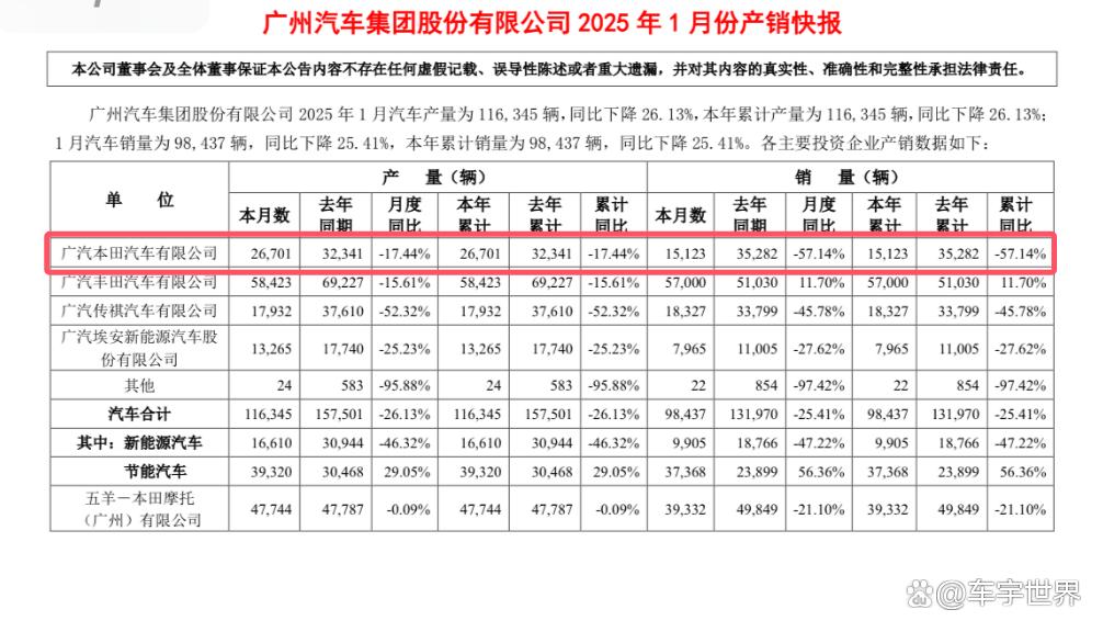 广汽集团发布的最新数据显示,2025年1月份,广汽本田的单月销量为15123台,同比下滑了57.14%。