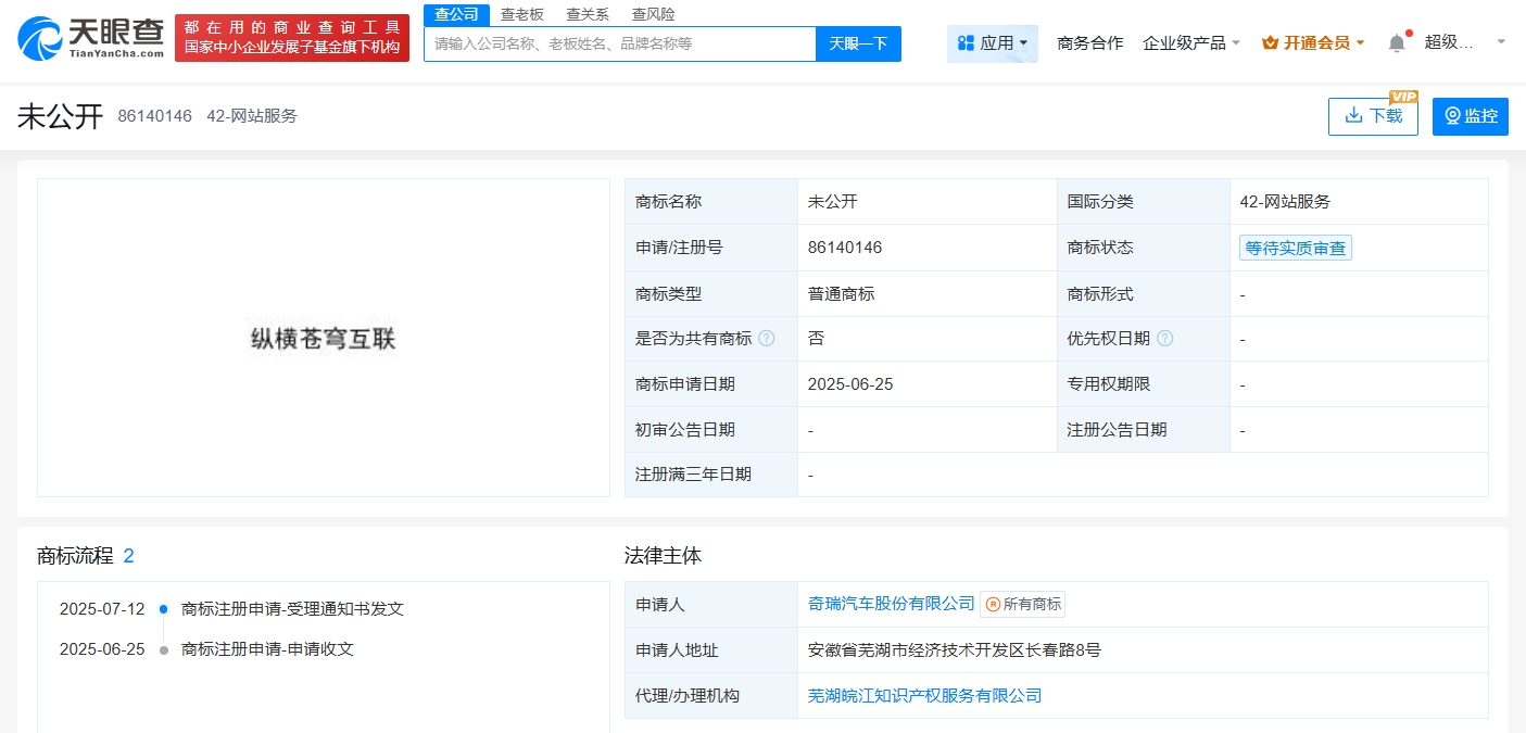 天眼查App显示,近日,奇瑞汽车股份有限公司申请注册多枚“纵横乾昆智驾”“纵横苍穹互联”“纵横舒压智能氧舱”“纵横灵感座舱”商标,国际分类涉及运输工具、网站服务等,当前商标状态均为等待实质审查。