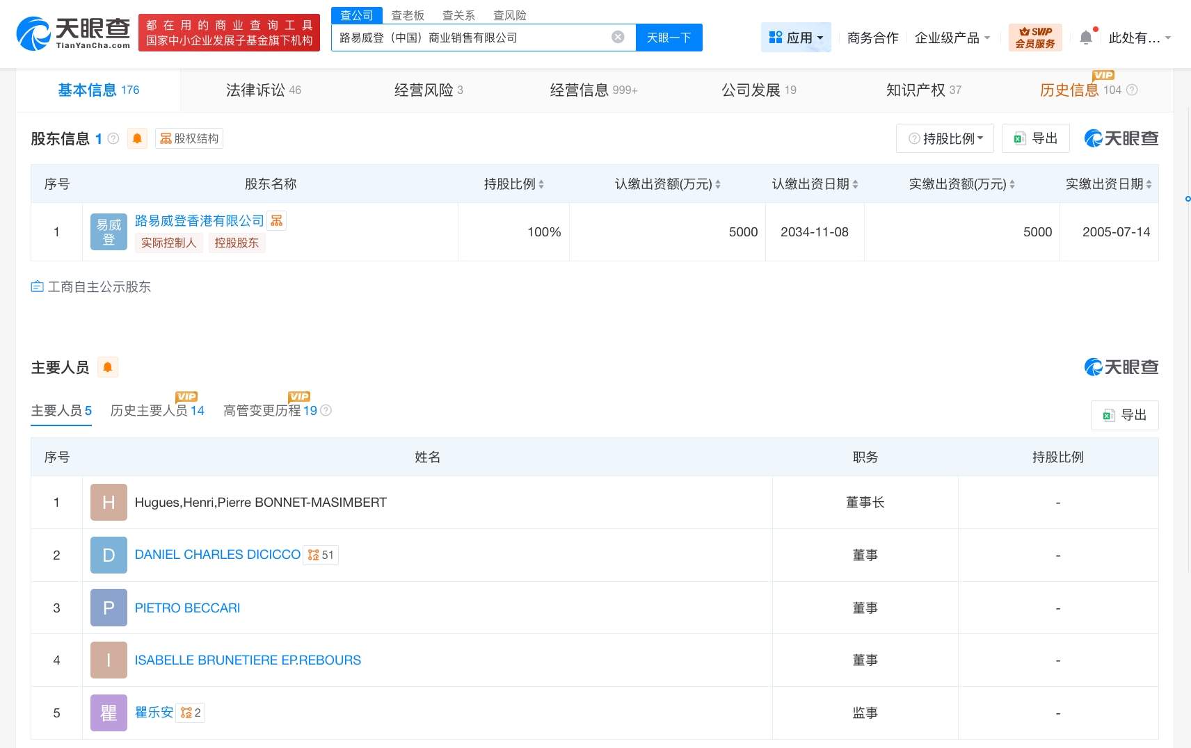 路易威登(中国)商业销售有限公司成立于2004年11月,注册资本5000万人民币,经营范围含出版物零售、食品销售、酒类经营、皮革制品销售、箱包销售、服装服饰批发、服装服饰零售等,由路易威登香港有限公司全资持股。