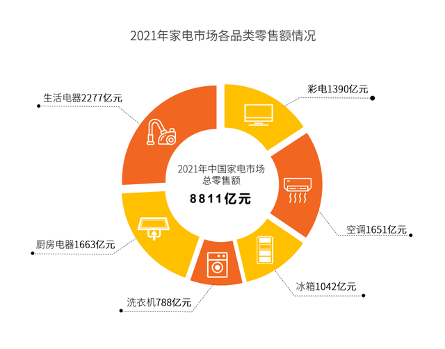 2021年,绝大多数家电品类重拾增长,除彩电和空调外,各大品类的市场规模达到或超过疫情前水平。其中,彩电1390亿元,同比增长7.9%;空调1651亿元,同比增长2.2%;冰箱1042亿元,同比增长7.2%;洗衣机788亿元,同比增长7.1%;厨房电器1663亿元,同比增长5.0%;生活电器2277亿元,同比增长6.6%。