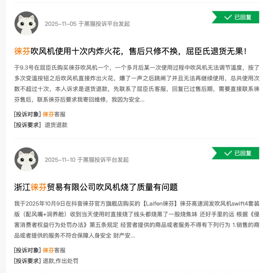 在黑猫投诉平台上,包含徕芬词条的投诉已超1400条。