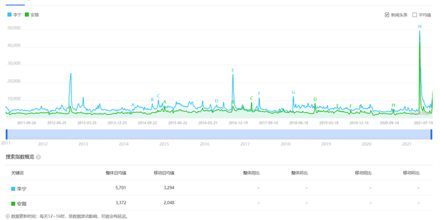 不过从另一个角度,品牌价值来看,安踏就很难超过李宁了,这可以从品牌热度方面发现一丝端倪。从百度指数来看,李宁始终压安踏一头。