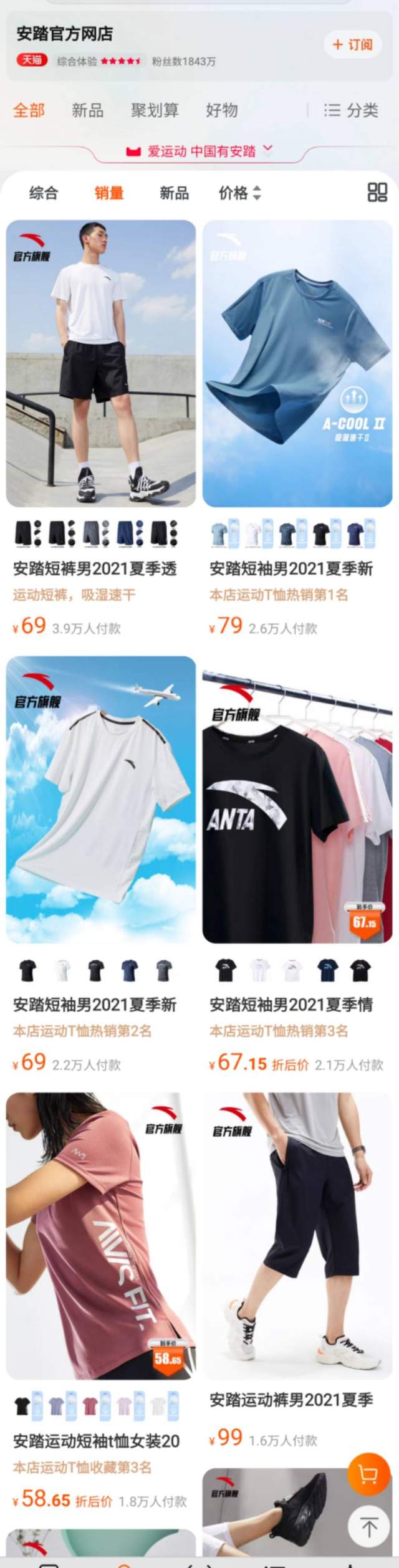 在线下门店数量上,安踏品牌店处在逐步缩减的状态。2018年、2019年和2020年,安踏品牌店分别为10057家、10516家和9922家;在线上安踏淘宝店铺,销量最高的大部分是几十元的T恤短裤,前十款产品中的运动鞋甚至没有超过三百元的。