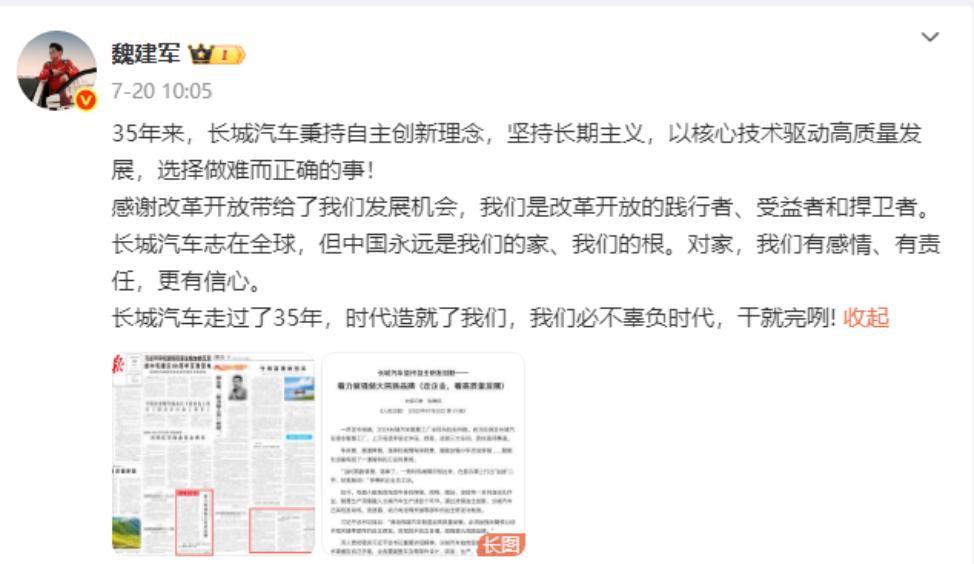 但就像他自己说的:“消费者需要的不是广告话术,而是敢说实话的魏建军”。现在魏建军公开发言的含金量正在逐渐显现:5 月底,工信部表态,要加大汽车行业 “内卷式” 竞争整治力度,维护公平有序的市场环境。近期,李强总理主持的国务院常务会议指出,要规范新能源汽车产业竞争秩序。