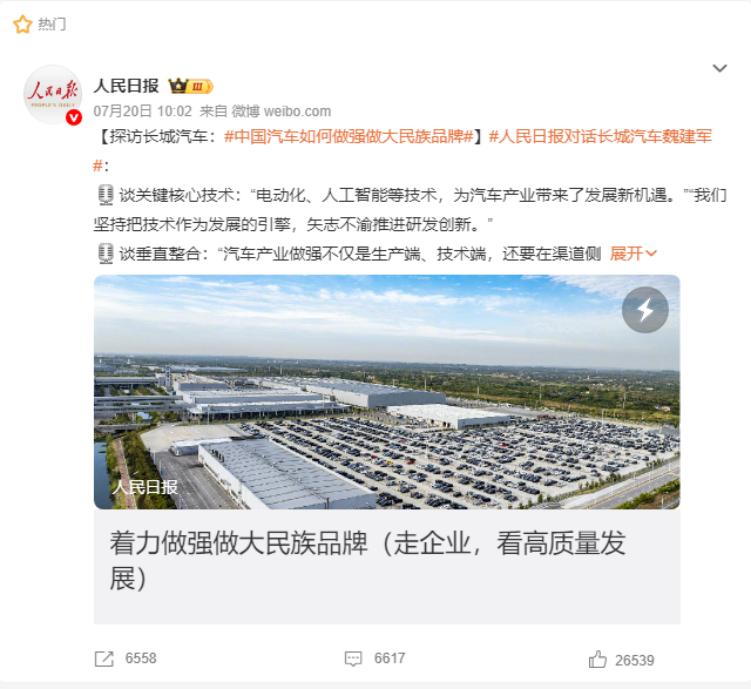 昨天,人民日报头版“走企业,看高质量发展”栏目刊登的最新报道——《长城汽车坚持自主研发创新——着力做强做大民族品牌》刷屏了各大社交平台。