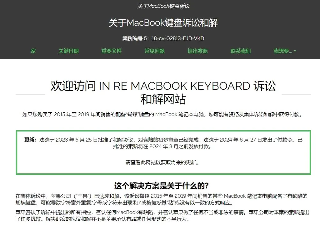 7 月 2 日消息,苹果公司更新博文,表示法院已经于 2023 年 5 月 25 日批准 MacBook 蝴蝶键盘集体诉讼和解,并已经完成了索赔的初步审查工作;法院于 2024 年 6 月 27 日签发付款令,将于 2024 年 8 月底之前对批准的索赔申请进行赔付。