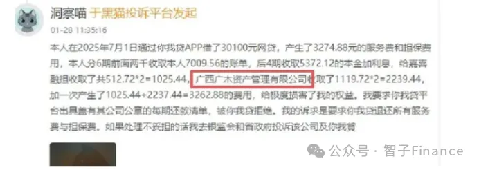 无独有偶,另一位用户投诉称,其于2025年7月1日通过你我贷APP借款30100元,平台合计收取3274.88元的服务费及担保费用,其中3262.88元由广木资管收取,收费明细模糊且未提前告知。