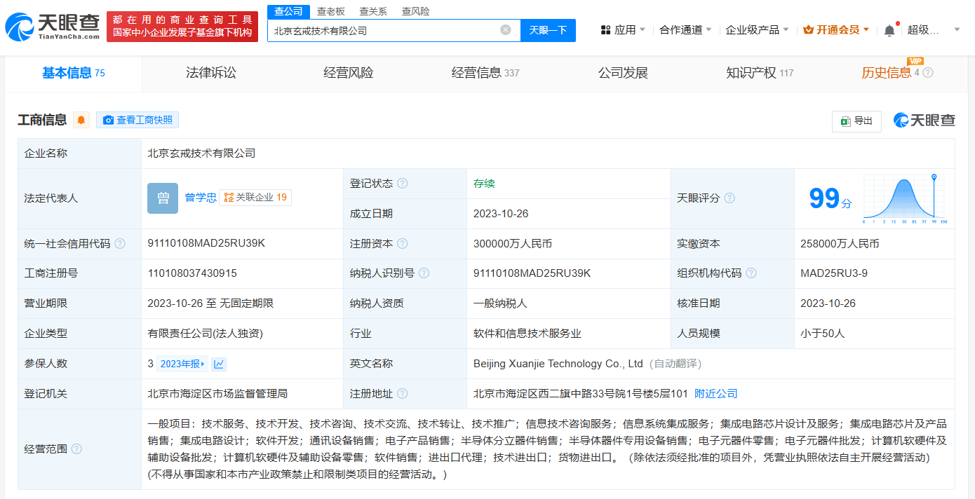 该公司成立于2023年10月,法定代表人为曾学忠,注册资本30亿人民币,经营范围包括集成电路芯片设计及服务、集成电路芯片及产品销售等,由北京玄戒信息科技有限公司全资持股。近日,小米公布自主研发设计的芯片玄戒O1,引发多方关注。