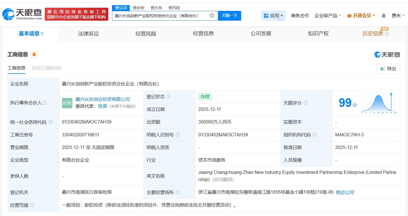 天眼查App显示,近日,嘉兴长创战新产业股权投资合伙企业(有限合伙)成立,执行事务合伙人为嘉兴长投创业投资有限公司,出资额30亿人民币,经营范围为股权投资,由嘉兴市人才投资服务有限公司、嘉兴市政府股权投资基金有限公司、嘉兴长投创业投资有限公司共同出资。