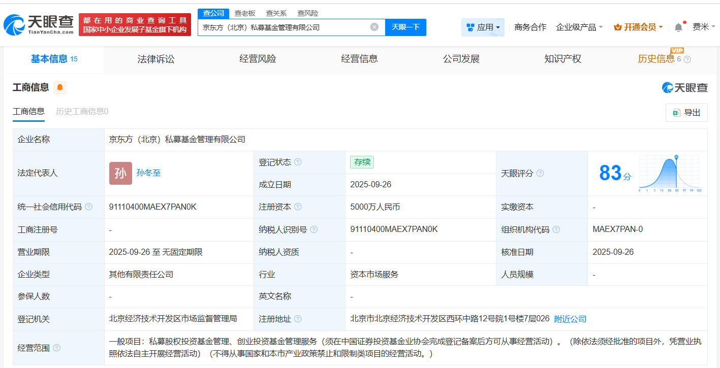 近日,京东方(北京)私募基金管理有限公司成立,法定代表人为孙冬至,注册资本5000万人民币,经营范围为私募股权投资基金管理、创业投资基金管理服务,由京东方A(000725)旗下京东方创新投资有限公司、北京电控产业投资有限公司共同持股。