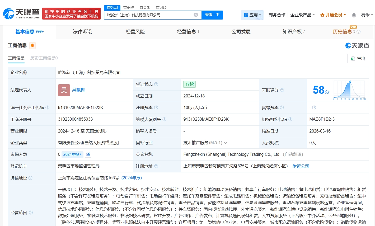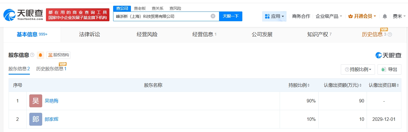 峰浙新(上海)科技贸易有限公司成立于2024年12月,注册资本100万人民币,经营范围含新能源原动设备销售、共享自行车服务、电池销售等。股东信息显示,该公司由郎家辉及上述新增股东共同持股。