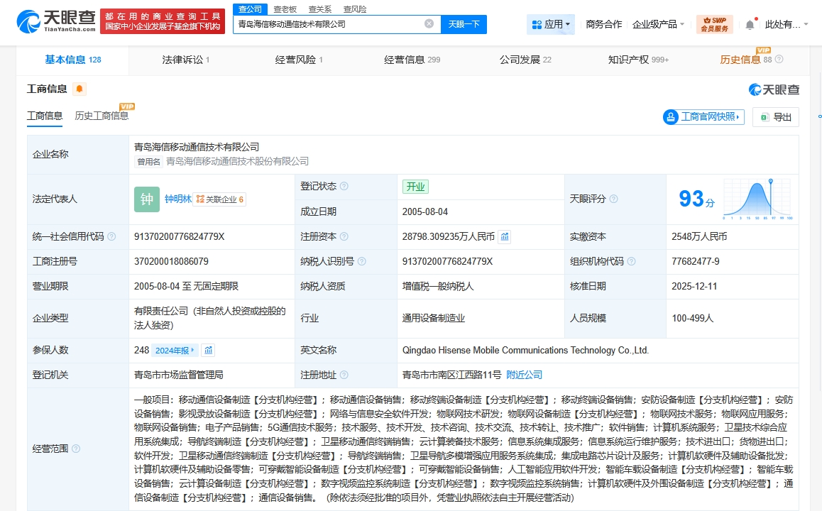 天眼查App显示,近日,青岛海信移动通信技术有限公司发生工商变更,注册资本由2548万人民币增至约2.9亿人民币,增幅约1030%。
