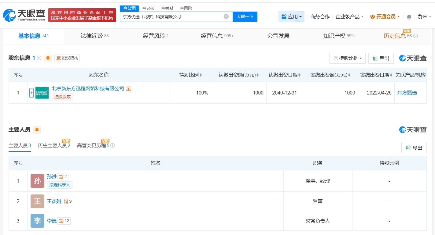 天眼查App显示,近日,东方优选(北京)科技有限公司发生工商变更,孙东旭卸任法定代表人、执行董事、经理,孙进接任法定代表人、经理并担任董事。