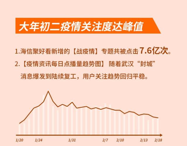 同时,与疫情相关的新闻专题和影视剧颇受关注。海信聚好看于2月1日正式上线“战疫情”专题,截至2月18日点击率达7.6亿次。从疫情资讯每日点播量趋势图来看,1月26日(正月初二)疫情关注度达到峰值,随着全国支援武汉有力措施展开,到复工后逐步回归平稳。