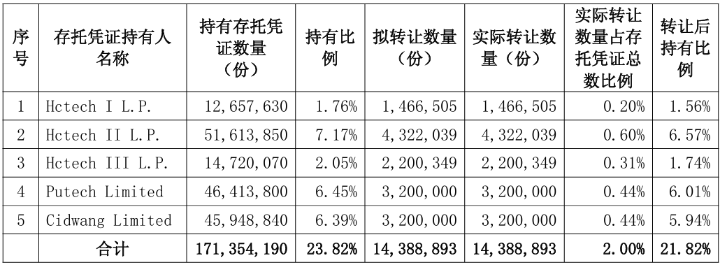 同时,Hctech I L.P减持致使公司实际控制人及其一致行动人持有存托凭证减少232万份,持有比例减少0.32%。