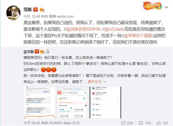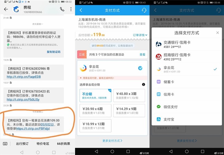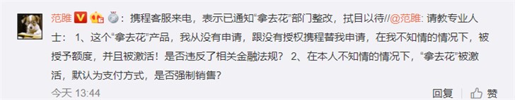 据该网友描述,在自己支付票款的时候,携程默认使用了一款名为“拿去花”的借贷产品,用户质疑称,“我都不知道什么是‘拿去花’”,“如果没在意,逾期了影响我征信,谁负责?!”