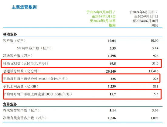 分析指出,中国移动业绩增速放缓背后,主要是由于个人移动业务业绩不佳的影响。财报显示,今年前三季度,中国移动的移动业务客户数从今年上半年的10.00亿增长至10.04亿,5G网络客户数从5.14亿增长至5.39亿。但尴尬的是,中国移动的移动ARPU值(平均每个用户贡献的通信业务收入)却从51.0元/户/月下降至49.5元/户/月。