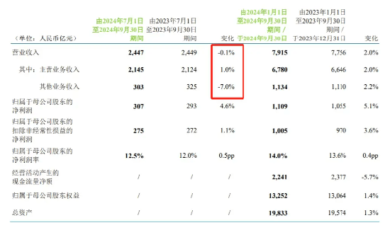第三季度中国移动营收2447亿元,同比下降0.1%。其中,主营业务收入为2145亿元,同比增长1.0%。其他业务收入为303亿元,同比下滑7.0%;EBITDA为808亿元,同比下滑5.0%。