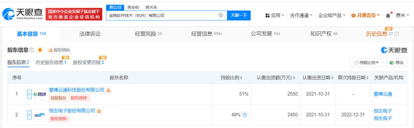 天眼查App显示,近日,金锐软件技术(杭州)有限公司发生工商变更,新增慧博云通(301316)为股东,同时法定代表人和多位高管发生变更。