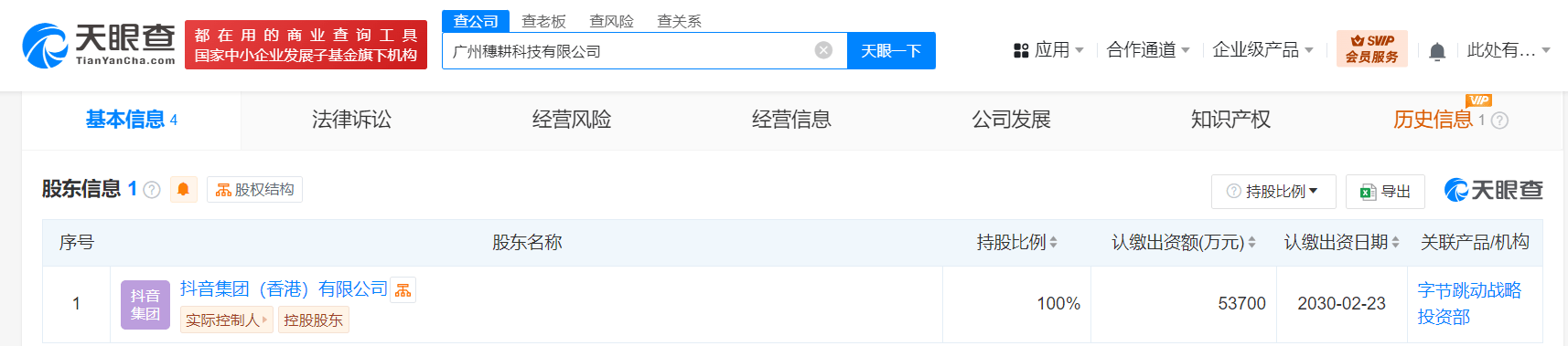 天眼查App显示,近日,广州穗耕科技有限公司成立,法定代表人为陈冠宇,注册资本5.37亿人民币,经营范围为技术服务、技术开发、技术咨询、技术交流、技术转让、技术推广,软件开发,信息系统集成服务,信息技术咨询服务,非居住房地产租赁,物业管理。股东信息显示,该公司由抖音集团(香港)有限公司全资持股。