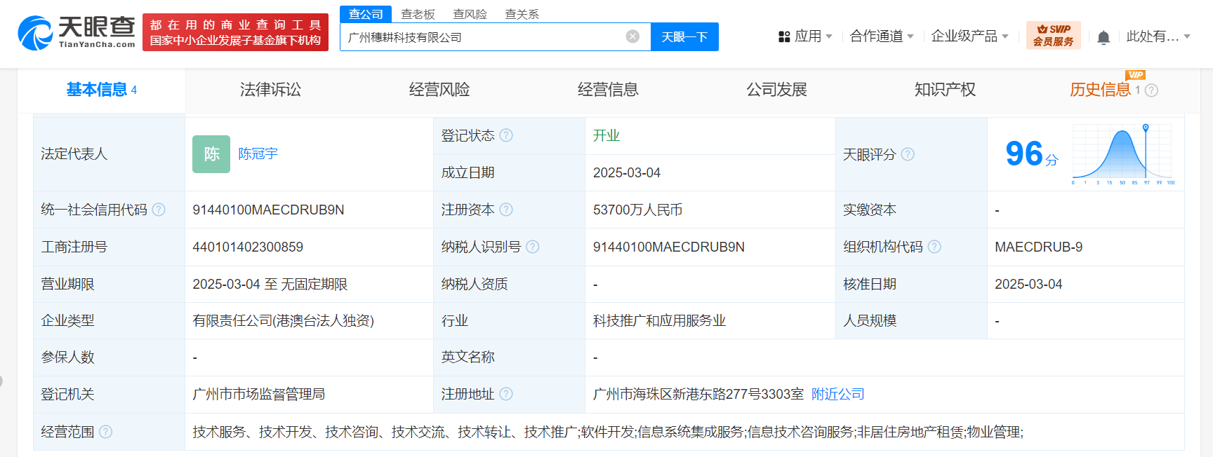 近日,广州穗耕科技有限公司成立,法定代表人为陈冠宇,注册资本5.37亿人民币,经营范围为技术服务、技术开发、技术咨询、技术交流、技术转让、技术推广,软件开发,信息系统集成服务,信息技术咨询服务,非居住房地产租赁,物业管理。