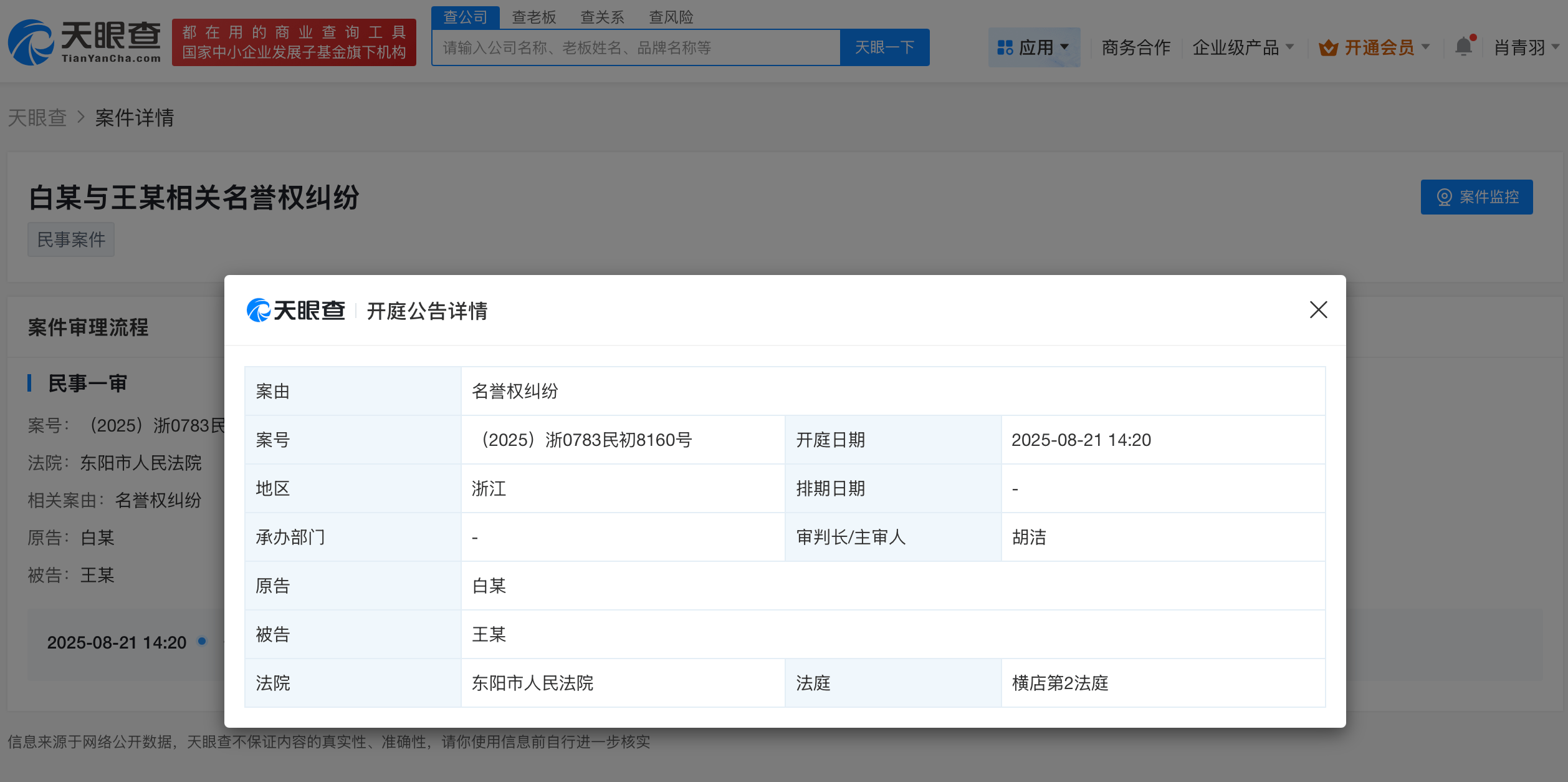 近日,白梦妍(白鹿)新增名誉权纠纷案件,被告为王某某,该案将于8月21日在东阳市人民法院开庭审理。
