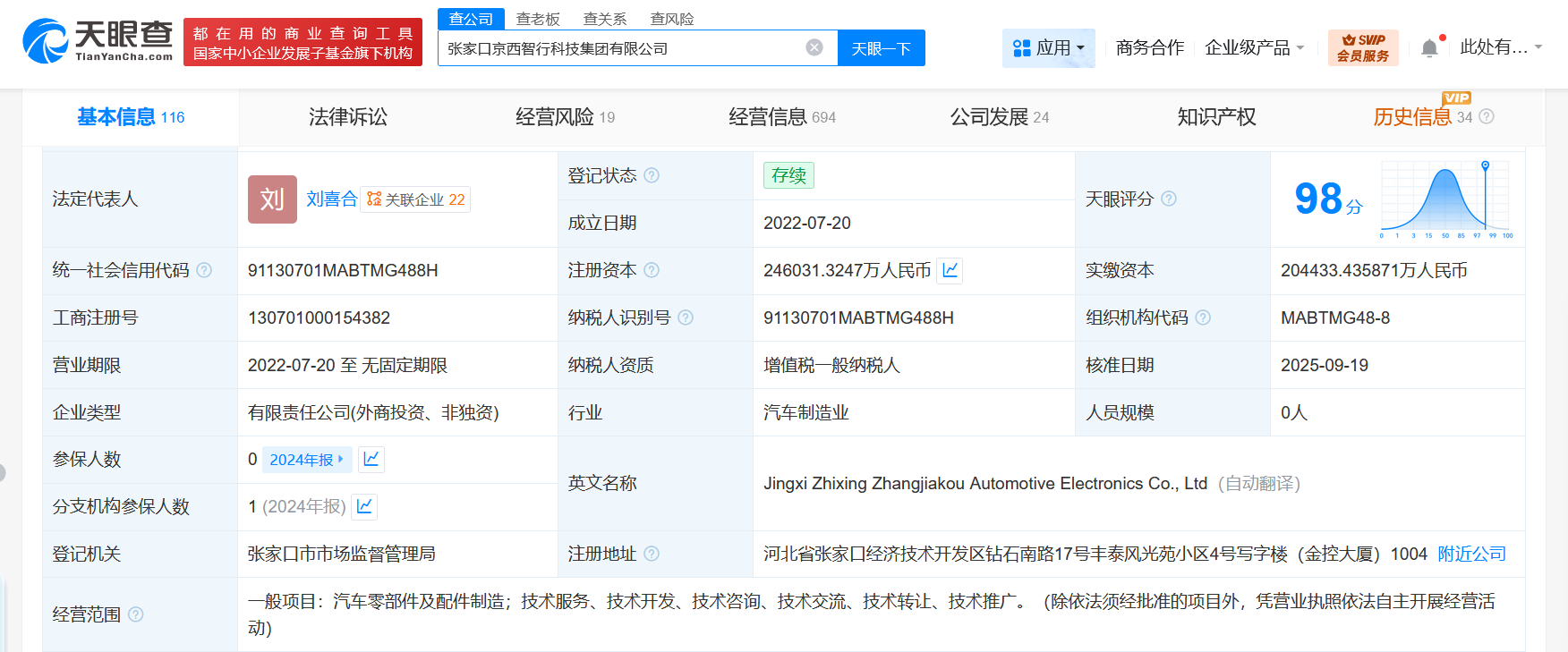 该公司成立于2022年7月,法定代表人为刘喜合,注册资本约24.6亿人民币,经营范围为汽车零部件及配件制造,技术服务、技术开发、技术咨询、技术交流、技术转让、技术推广。股东信息显示,该公司现由张家口睿投股权投资基金合伙企业(有限合伙)、深圳市投控基石新能源汽车产业私募股权投资基金合伙企业(有限合伙)、张家口慧投股权投资基金合伙企业(有限合伙)及上述新增股东等共同持股。