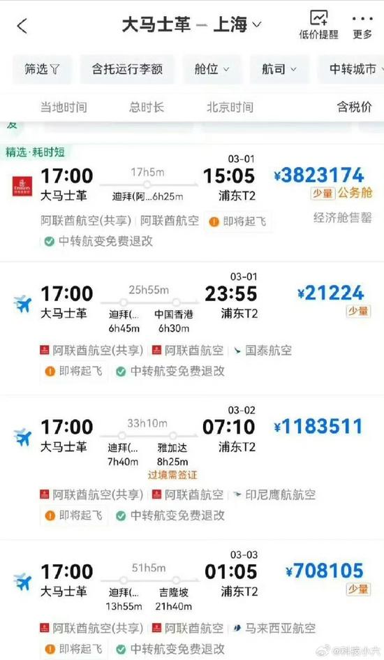 但就在此时,2月28日,有网友晒出,携程APP上从大马士革到上海的机票,最高竟然高达555万,价格低的也分别高达382万、118万、70万不等。