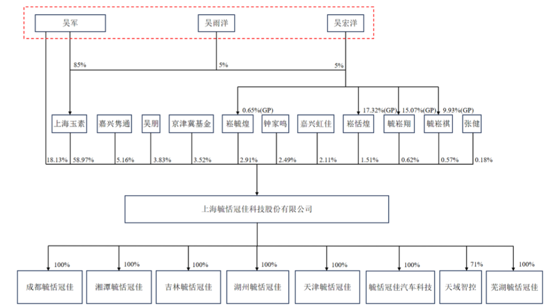 根据招股书可知,毓恬冠佳的实际控制人是吴军及其两个女儿吴宏洋、吴雨洋,通过直接及间接方式合计控制了公司82.70%的股份。吴军配偶李筱茗通过上海玉素间接持有贵司2.95%股权;吴军胞弟吴朋持有贵司3.83%股权,综合来看吴军家族合计持股近90%。
