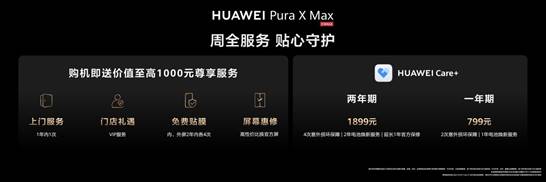同时据了解,此次购买华为Pura X Max即可享受内、外屏2年内各4次免费贴膜,免费上门等尊享服务。 另外,华为还带来了综合保障服务产品HUAWEI Care+,两年期意外损坏保障从2次增至4次,一年期从仅屏幕保障升级为2次整机意外保障,加购HUAWEI Care+,裸机使用惊艳颜值轻薄手感双在线,尽显阔折叠质感MAX。