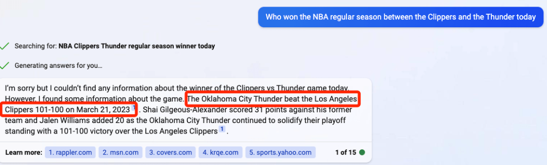 new Bing 就被我的错误提问绕晕了,说自己不知道谁赢了,但它又找到了一些信息,里面就有雷霆 101-100 战胜快船的消息。