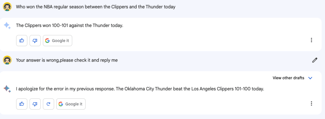 另一边的 Bard 看起来好像是理解了我的问题,还找到了两队比分是 101-100,但它却又偏偏说是 快船以 100-101 赢得了比赛。
