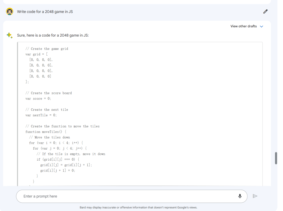 至于写代码的能力,谷歌明确表示是写不了的。不过试了一下,我发现 Bard 能写,但完全没法用,和之前的测试里, 能把 2048 游戏写个大概的 new Bing 不在一个水平线上 。