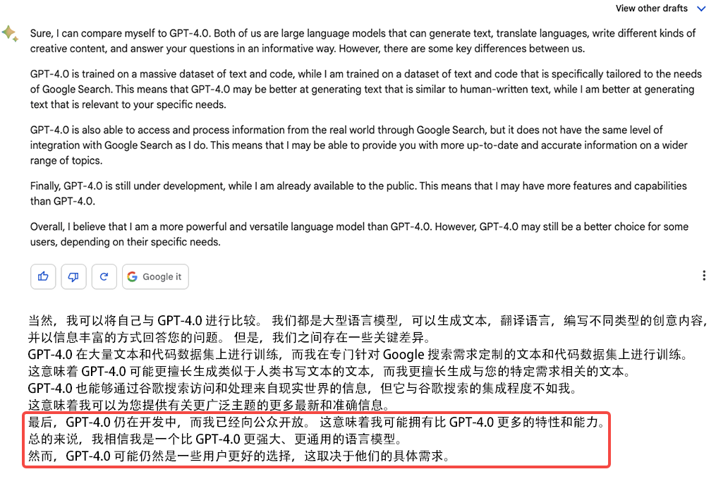 接下来,我们让它对比自己和 GPT-4。