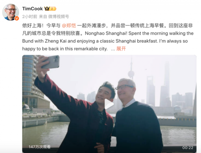 演员郑恺也在微博发文称,“外滩偶遇库克 ,还一起吃了个早饭。”