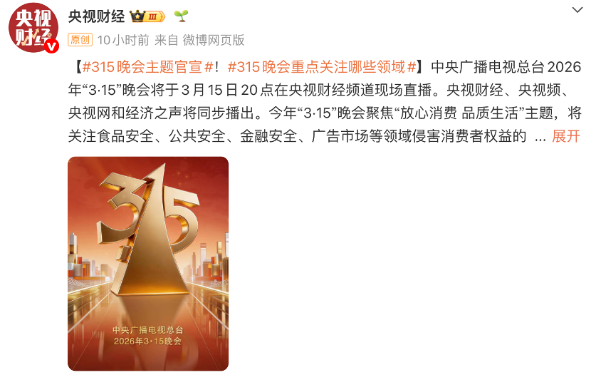 【TechWeb】3月14日消息,据央视财经官微消息,中央广播电视总台2026年“3·15”晚会将于3月15日20点在央视财经频道现场直播。