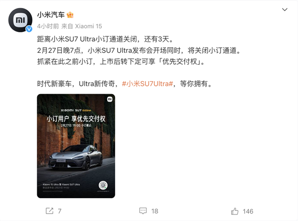 小米SU7 Ultra发布会倒计时:小订通道将关闭,静态品鉴全国开展汽车