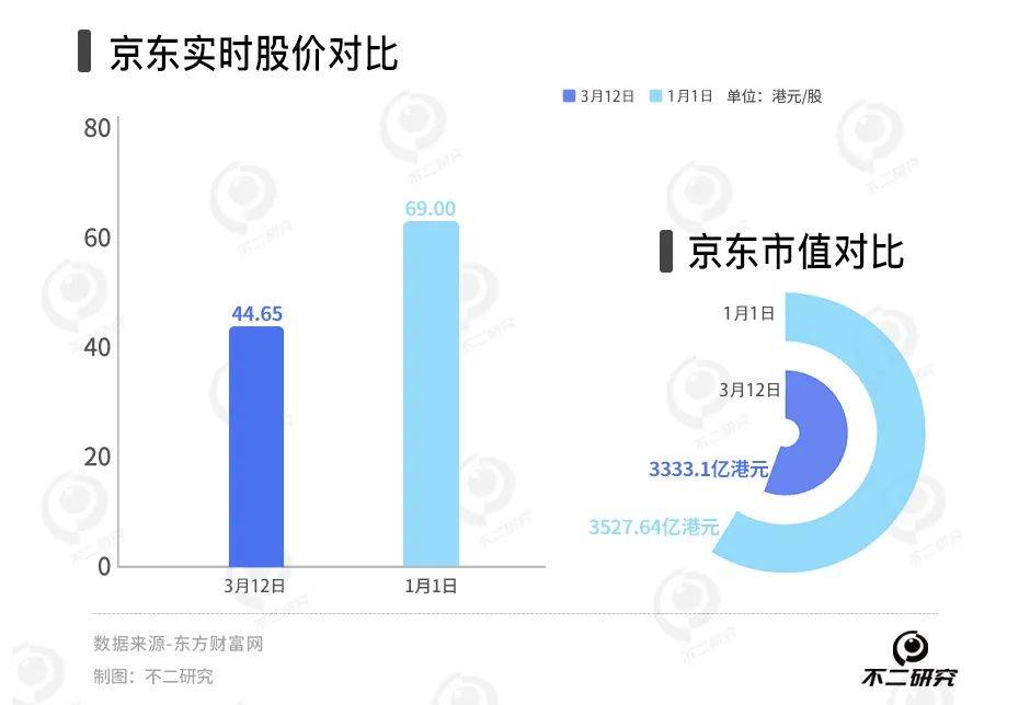 截至3月12日港股收盘,京东集团报收98.55港元/股,对应市值3333.23亿港元(约折合人民币3056.11亿元);对比今年1月的市值高点3527.64亿港元,其市值已经蒸发194.41亿港元(约折合人民币178.25亿元)。