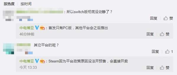 当玩家询问是否会有主机板时,官博回复表示:《圣女战旗》将在PC平台首发,主机版(PS4和Switch)会在之后推出,Steam商店因为政策原因无法直接开预售,但会在发售当天直接开卖。