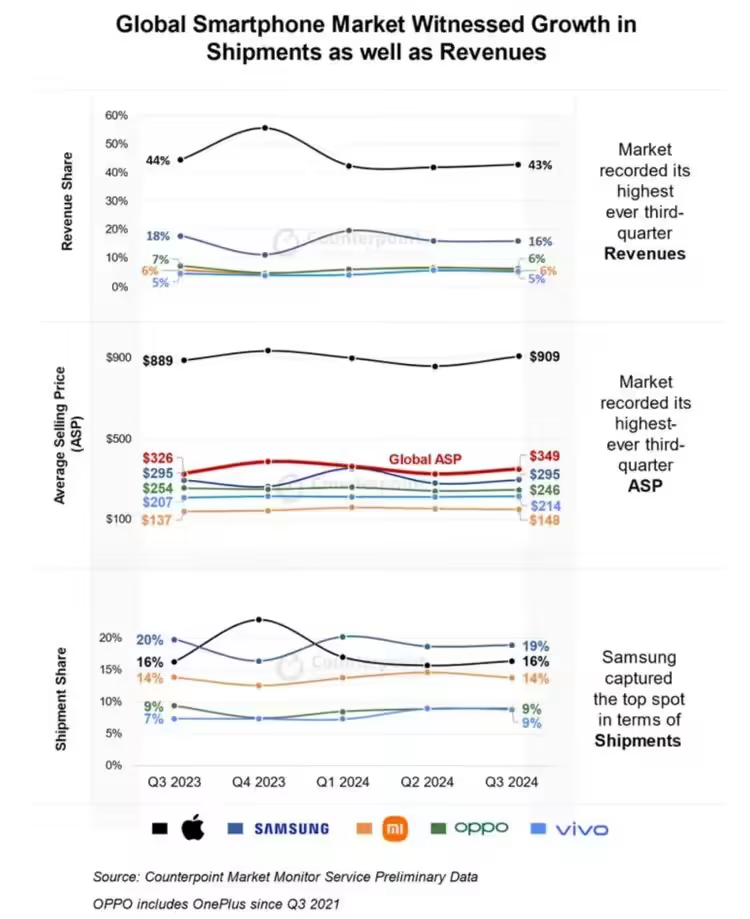 智能手机ASP的上涨,与物料清单(BoM)成本的提升密切相关。其中,手机芯片(SoC)价格的上涨成为推动售价上升的关键因素。Counterpoint提供的数据显示,2024年第三季度,全球智能手机的平均售价达到了349美元,创下Q3历史新高。在五大手机厂商中,苹果的平均售价为909美元,三星为295美元,OPPO为246美元,vivo为214美元,而小米为148美元。